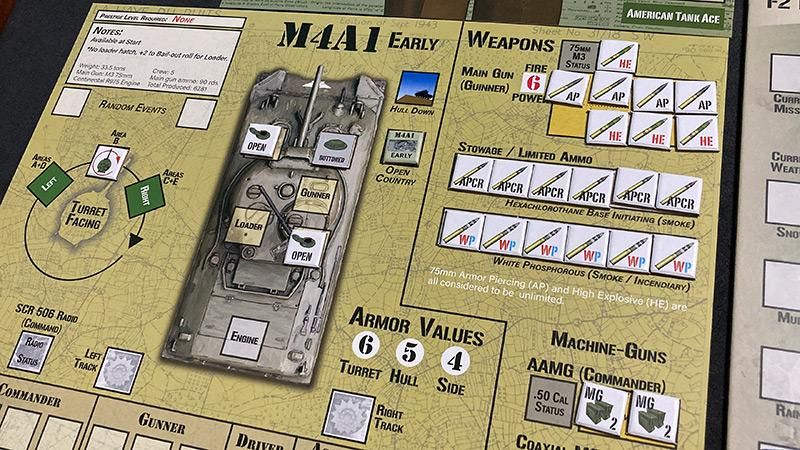 『American Tank Ace』は、プレイヤーがM4シャーマン戦車の戦車長となり、1944年6月からの西部戦線を戦い抜くソリティア・ゲームです。まずはフォート・ノックス戦車学校を卒業し、ノルマンディに上陸してからは任務をクリアして経験点を得て、その経験点を用いてスキルを上げることができます。戦功に応じて褒章・昇進もあり。次第に乗れる戦車のバリエーションが増えていきます──M4シリーズの様々なバリエーションが用意されているので、「シャーマニア」にはたまりません。最後はM26パーシングに乗れるかも?