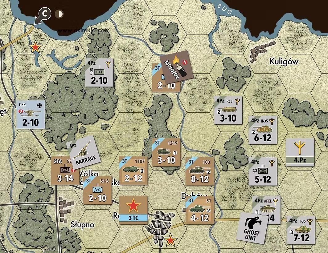 各活性化ラウンドでは、移動、オーバーラン攻撃、統制攻撃、予備の移動&攻撃を行います。ドイツ軍には移動中の敵ユニットに隣接されると直ちに1ヘクス退却できる「離脱」や、ソ連軍はユニット単位でしか行えないオーバーラン攻撃も、スタック単位で実行できるといった戦術的優位も再現されています。